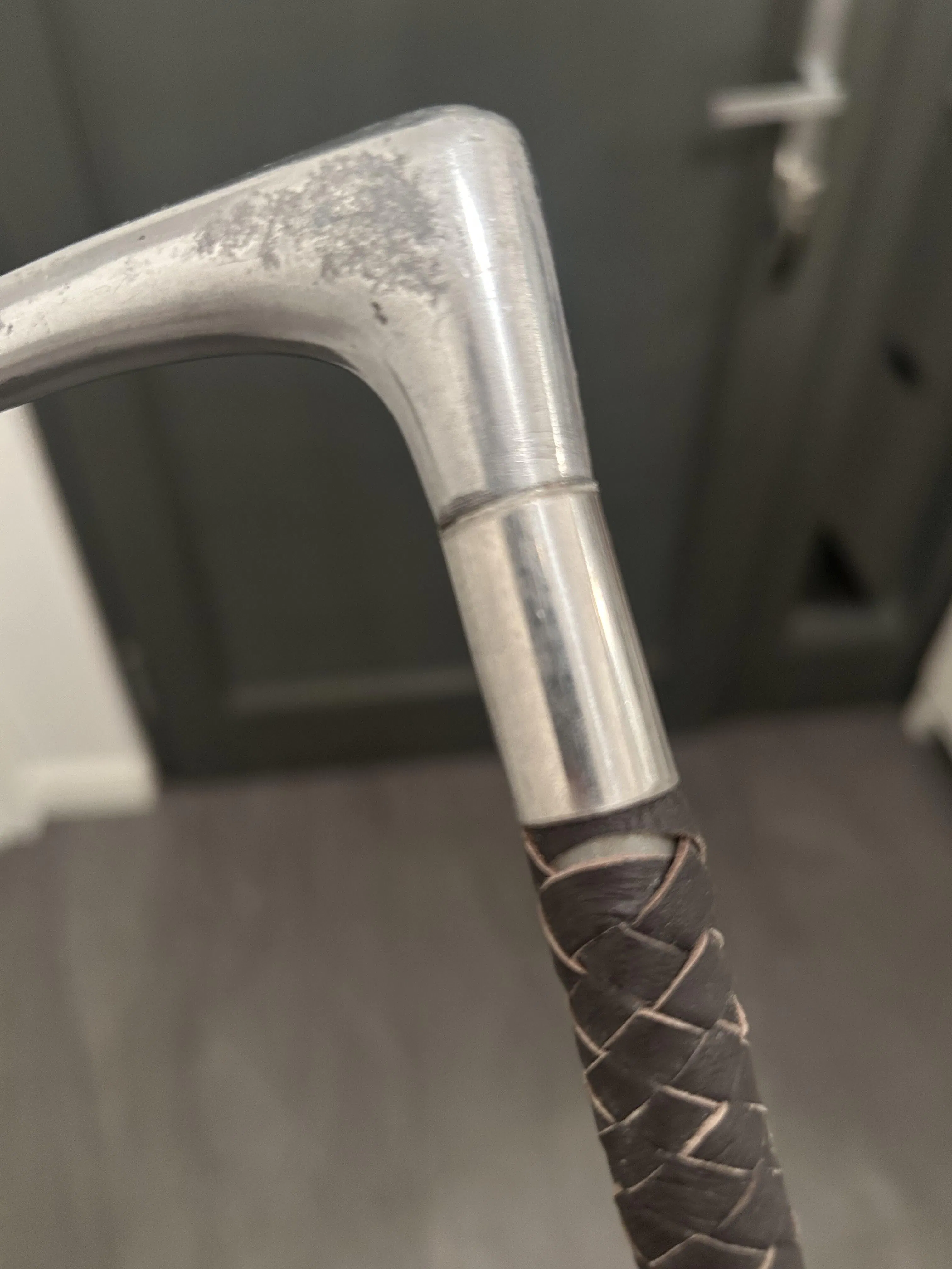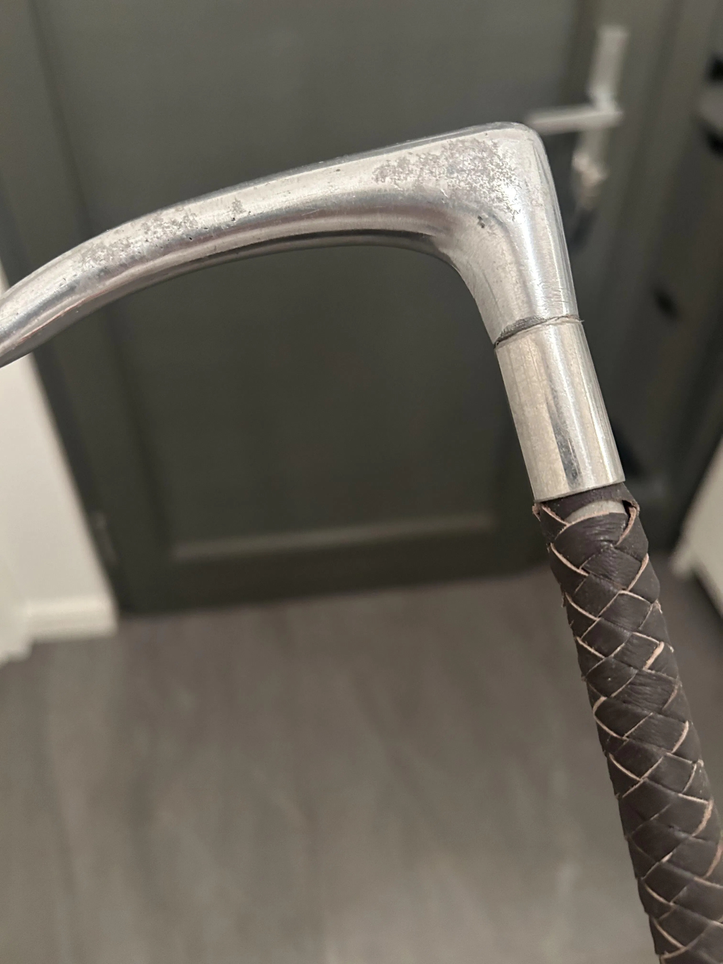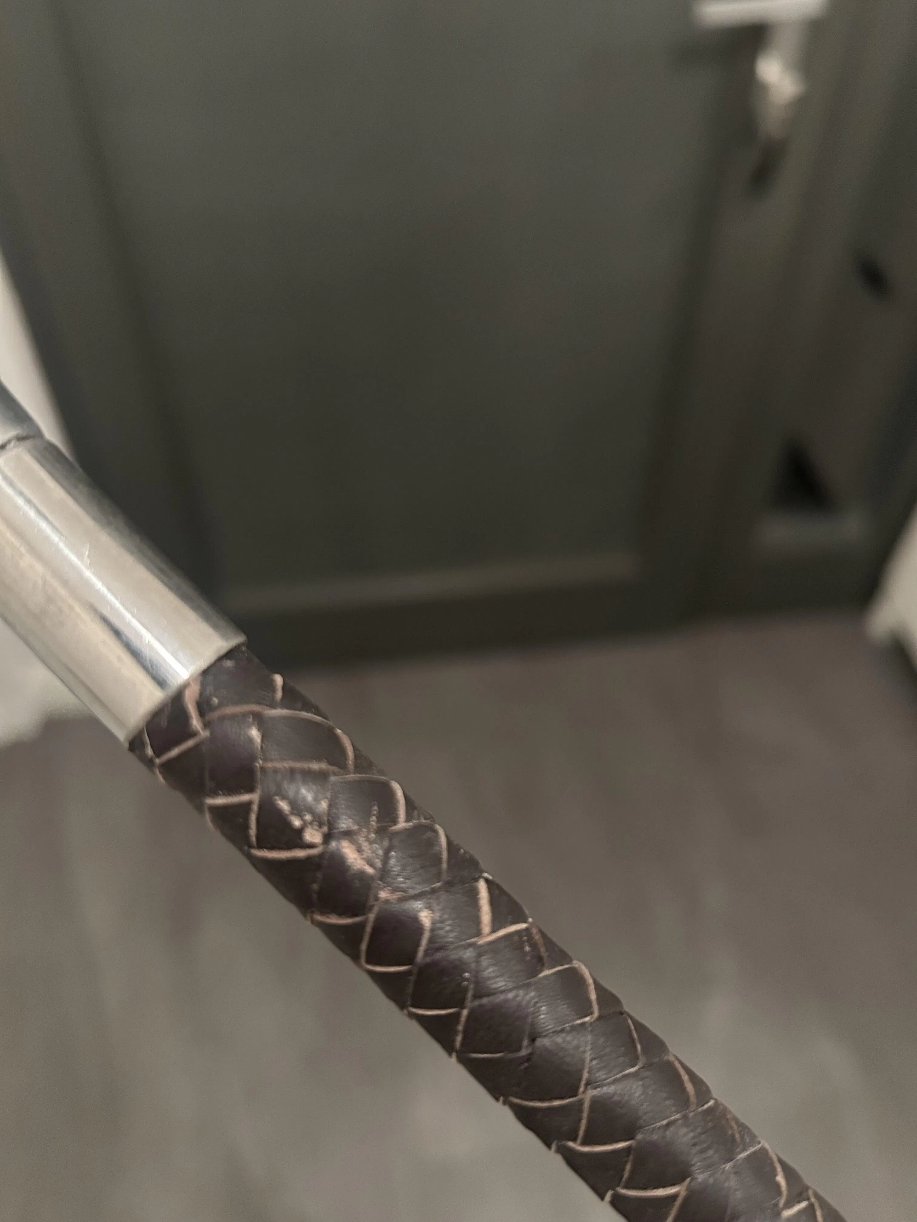 This leather horse riding crop is the smaller and lighter version of our two leather riding crops. Weighing just 140 grams it is ideal for young riders. The body is constructed from braided brown leather and the handle is cast from steel and silver plated. The end of the crop features a leather lash with a hole for a lash.
